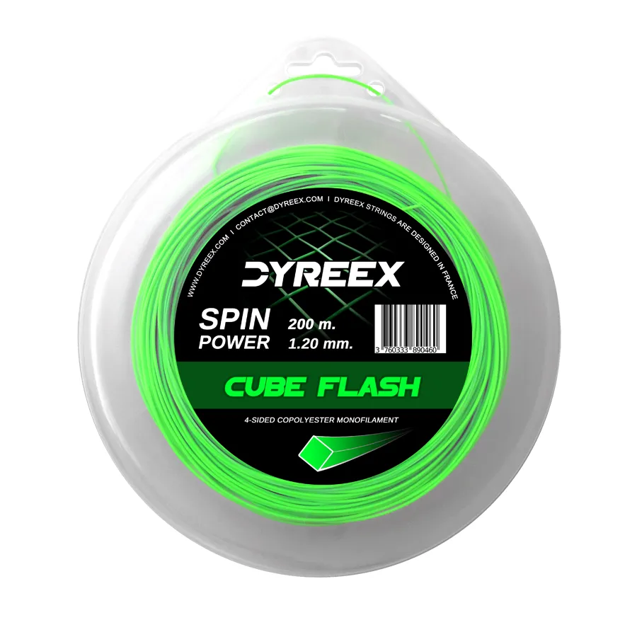 Although it is made from a stiff polyester base materal, we have injected special additives to improve comfort, power and feel. In addition, The Cube Flash has also a square shape, giving it a sharp bite and massive spin potential.