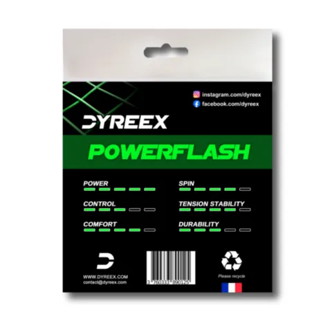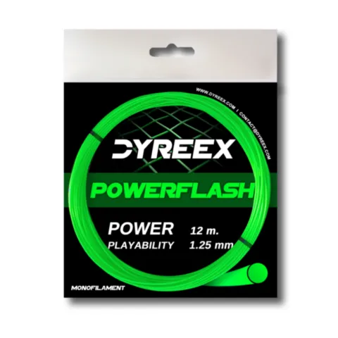 The Dyreex Powerflash string is the ultimate string for players looking for lots of power, good comfort, touch and of course versatility. Its structure is a monofilament co-polymer made of high-grade polymers reinforced by chemical additives. It provides a great feeling when hitting and will be highly appreciated by big hitters.