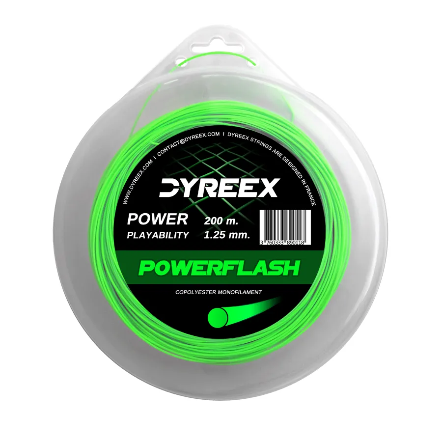 The Dyreex Powerflash string is the ultimate string for players looking for lots of power, good comfort, touch and of course versatility. Its structure is a monofilament co-polymer made of high-grade polymers reinforced by chemical additives. It provides a great feeling when hitting and will be highly appreciated by big hitters.
