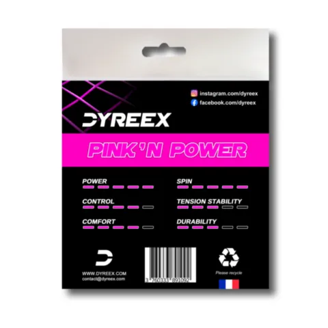 With the Pink'n Power, our goal was to design a string that would provide a level of comfort never before achieved with a monofilament. By adding a special additive up to the maximum possible, our teams were able to create a string with a remarkable flexibility (stiffness index of 0.42 kg/mm). Thus the impact on the articular chain and the arm muscles is greatly reduced. The Pink'n Power, as its name indicates, gives maximum power while easing the player's arm; the speed of the ball can be obtained without necessarily having muscular power. The spin is good too because the string is lightly structured and the tension stability is constant over time, without any string movement.
