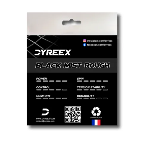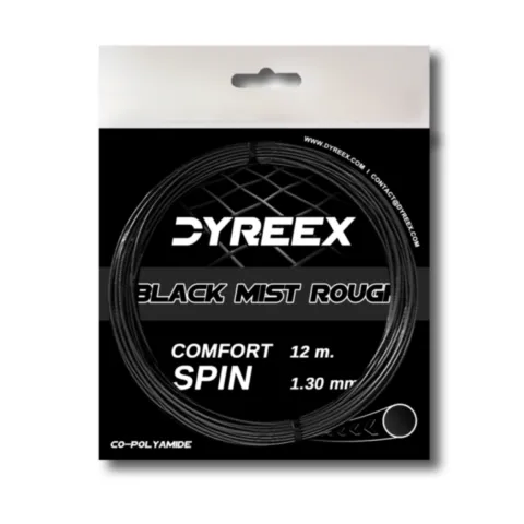 Fruit d'un long travail de ressource et développement, le cordage Black Mist Rough est un tout nouveau type de cordage monofilament à structure en co-polyamide. L'objectif est de répondre aux besoins des joueurs utilisant des cordages multifilaments et recherchant plus de durabilité, ainsi qu'à ceux des compétiteurs jouant habituellement en monofilament et aspirant à un produit plus confortable pour le bras et plus résistant qu'un multifilament. De plus, son revêtement extérieur en silicone et sa surface rugueuse facilite grandement la prise d'effet.