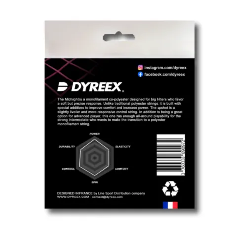 The Midnight is a monofilament co-polyester designed for big hitters who favor a soft but precise response. Unlike traditional polyester strings, it is built with special additives to improve comfort and increase power. The upshot is a slightly livelier and more responsive control string.