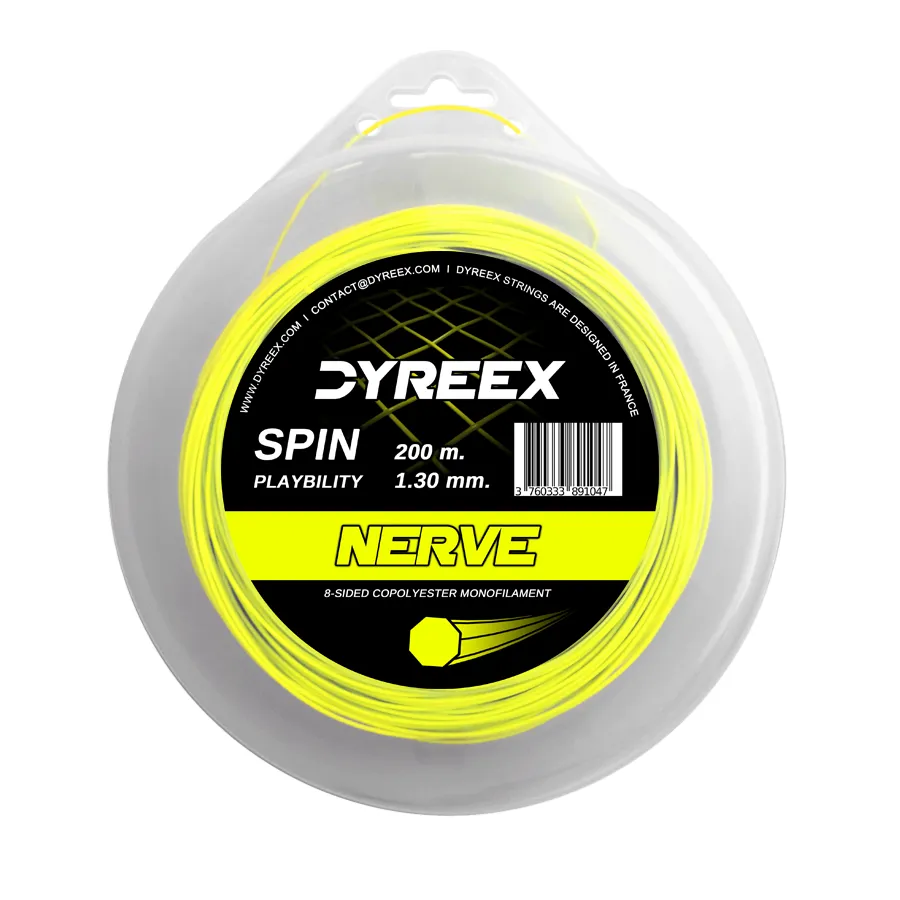 The Dyreex Nerve is a string that provided a very high level of comfort for a monofilament and this was achieved thanks to the very high elasticity of the string. It is a comfortable and all-round string with an octogonal shape to improve ball-bite and spin. While the string is very spin friendly, it provides a high level of depth control on flat shots and a great power while protecting the player's arm. The speed of the ball can be achieved without necessarily having muscle power.